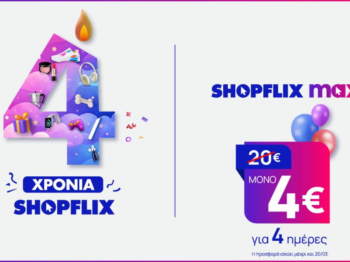 Το SHOPFLIX συμπληρώνει τέσσερα χρόνια παρουσίας και γιορτάζει μία ταχύτατη πορεία ανάπτυξης γεμάτη επιλογές, καθημερινές ανακαλύψεις και εμπιστοσύνη από εκατομμύρια καταναλωτές σε όλη την Ελλάδα.